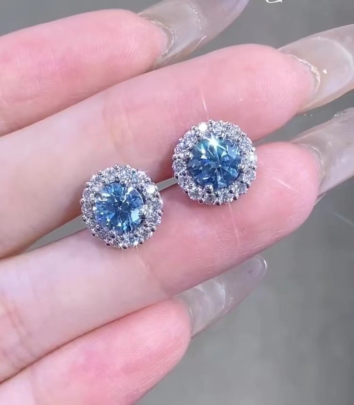 Des bijoux en diamants bleus, une coupe ronde, des fiançailles, des idées de mariage, des boucles d'oreilles en diamant.